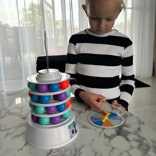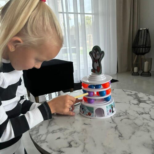 ✅ CUM FUNCȚIONEAZĂ - jocul presupune construirea unui turn - pe fiecare nivel trebuie să setați 9 bile multicolore , punem pariurile noastre pe cerc, iar în partea de sus așezăm cupola turnului cu o imagine a unui pinguin. . Apoi scoatem bile de la diferite niveluri ale turnului folosind bastoane in asa fel incat sa nu distrugem intreaga structura. Fiecare jucător învârte ruleta pentru a selecta culoarea mingii, care trebuie eliminată. Bilele după lovire cad în interiorul turnului și zboară prin gaura din bază . Sarcina jucătorilor este să le îndepărteze astfel încât turnul să nu se prăbușească și pinguinul să rămână deasupra. Jocul devine din ce în ce mai interesant și mai provocator pe măsură ce îndepărtați următoarele bile k, ceea ce reduce stabilitatea turnului .