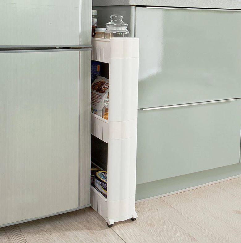 LOC SUPLIMENTAR PENTRU ACCESORIILE NECESARE - raftul mobil ingust de bucatarie este realizat din plastic rezistent. Suportul mobil de bucatarie are trei rafturi adanci in care putem gazdui cu usurinta multe accesorii la indemana, folosind spatiile inguste dintre dulapuri.