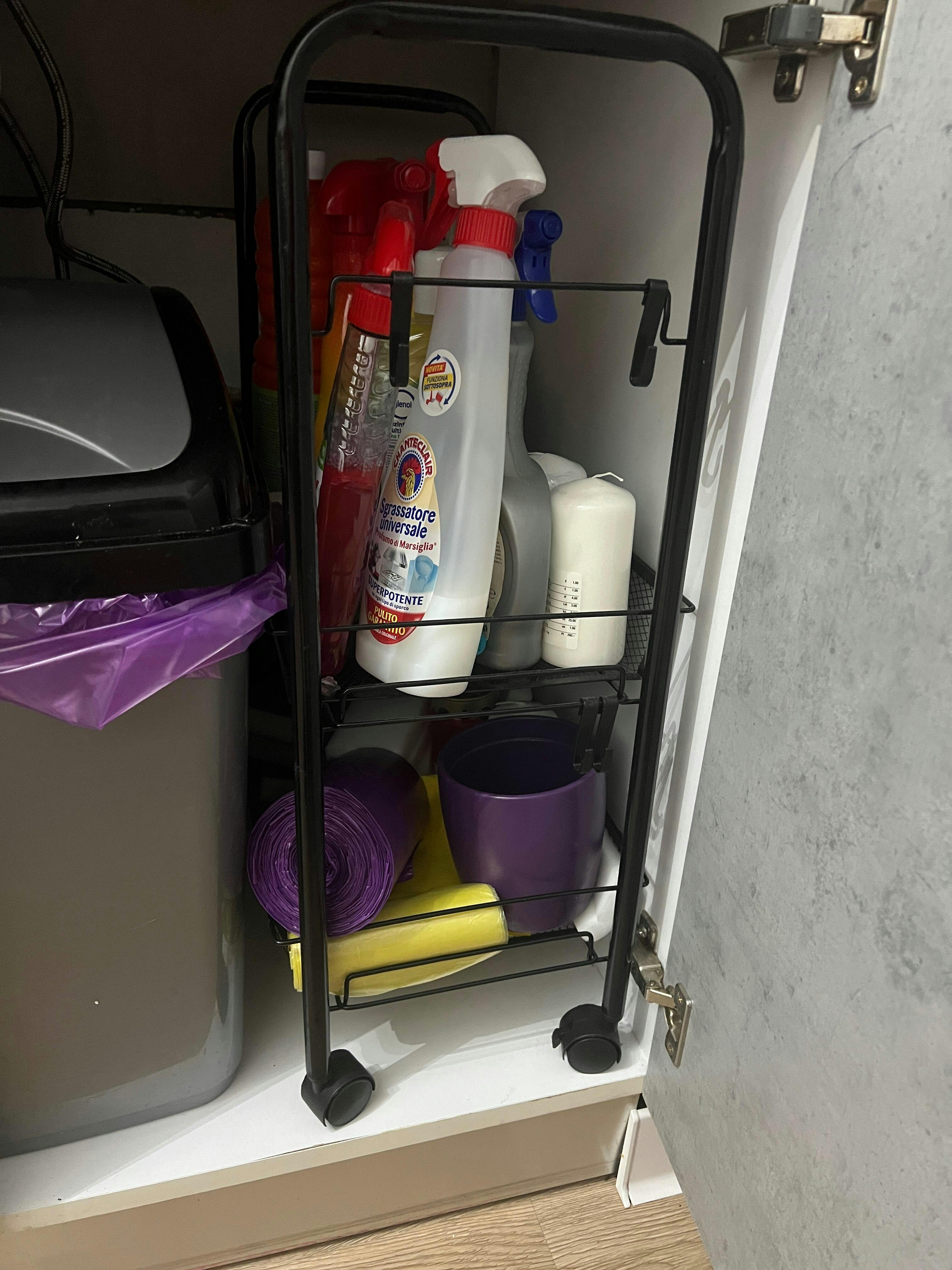 Trei rafturi sub forma de cos: Raftul dispune de trei niveluri tip cos care permit depozitarea organizata a diverselor accesorii. Fiecare raft are o capacitate de incarcare de pana la 7 kg, ceea ce permite depozitarea obiectelor mai grele, precum oale, ustensile de bucatarie, produse cosmetice sau articole de curatenie.Acces facil: Designul deschis al rafturilor permite accesul rapid la obiectele depozitate, facand organizarea spatiului mult mai eficienta si comoda. Aceasta face ca raftul sa fie ideal pentru utilizare ca spatiu suplimentar in bucatarie, baie sau chiar in birou.Mobilitate excelenta: Raftul este echipat cu patru roti durabile din material PP de inalta calitate, care asigura o miscare lina si usoara a raftului. Aceasta mobilitate iti permite sa muti raftul in functie de nevoi, oferind o flexibilitate sporita in organizarea spatiului.